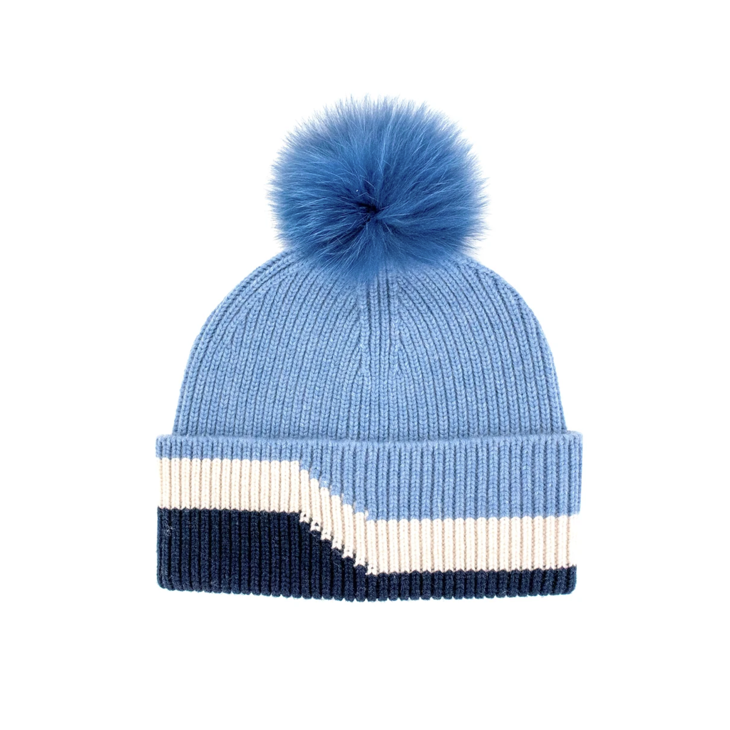 Cashmere Blend 3 Tone Beanie with Fox Fur Pom